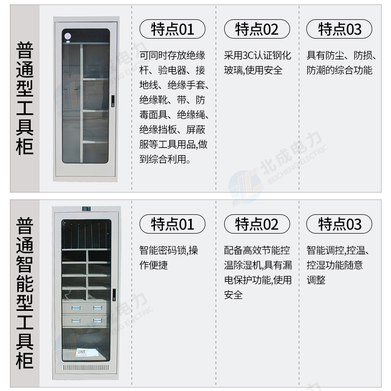 普通智能工具柜里面有一臺除濕機,柜體外面有一個數字顯示器顯示柜內溫濕度,可以通過顯示器上按鍵調節柜內溫濕度大小,結構簡單,操作方便,具體操作詳見智能工具柜說明書