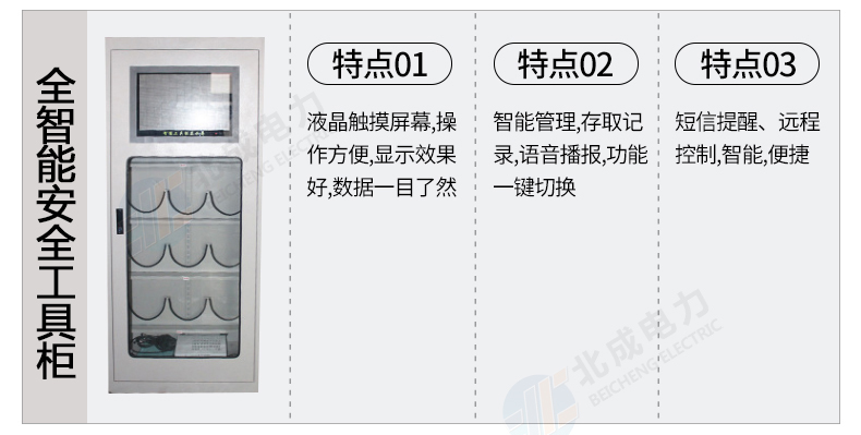 全智能工具柜一般是組合柜,三個工具柜或三個工具柜以上一組,每個工具柜內安有多個探頭,臺柜子上有一個大的LED顯示屏,可以隨時顯示柜內溫度濕度以及柜內每種安全工器具的試驗周期,還顯示使用中絕緣工具的使用數量和編號,絕緣工具拿出使用時柜內開啟識別系統,自動監視絕緣工具使用情況,絕緣工具復位后,自動關閉顯示窗口,恢復工器具試驗周期倒計時狀態。全智能工具柜具有對絕緣工具進行標識和分類管理的功能,能夠識別工具是否放錯了位置,并提醒工具檢驗時間。全智能工具柜微電腦控制,數控兼容,內采用冷凝型除濕機,類似小型空調,控溫除濕,保證絕緣工具使用時更安全。